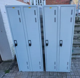Conjunto de taquillas metálicas de color gris claro, ideales para organizar espacios. Alto 1.50 ancho 60 fondo 50 - Cada taquilla cuenta con ventilación superior e inferior. - Cerradura individual con llave. - Diseño moderno y funcional. Precio unidad 180€ las dos 300€