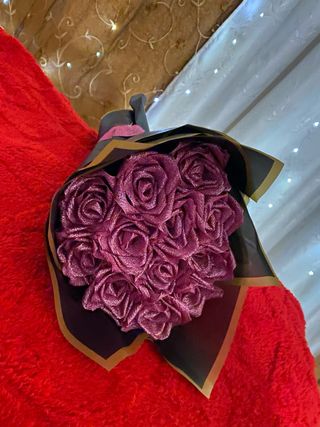 Elegante ramo de rosas artificiales con un acabado brillante. - Color morado intenso. - Textura satinada. - Presentado en un envoltorio negro y dorado.