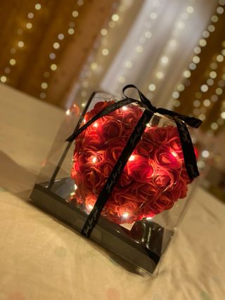 Precioso corazón de rosas rojas artificiales, decorado con luces LED y un lazo negro con el mensaje Just for you. - Base negra. - Caja transparente.