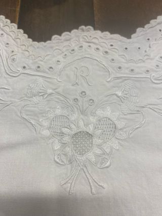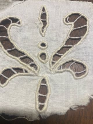 Preciosa tela antigua con intrincados bordados, encaje de bolillos y aplicaciones . Diseño floral y geométrico. Bordado detallado. Color blanco.Algodón. Hecho a mano 109x43cm
