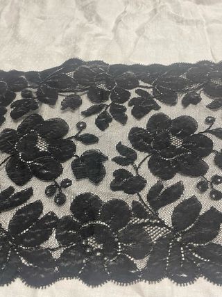 Precioso encaje negro con diseño floral, ideal para aplicaciones en ropa o manualidades. 94x30cm - Color: Negro - Diseño: Floral - Material: Encaje