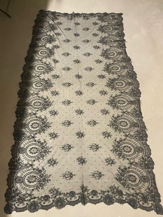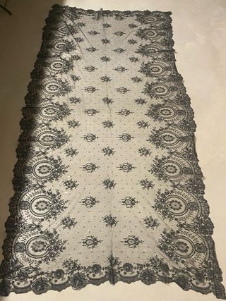 Mantilla grande de encaje negro, ideal para eventos especiales o como accesorio de moda. - Diseño de encaje hecha a mano - Borde festoneado. - Patrón floral y de puntos. Antigua 2m x 94cm