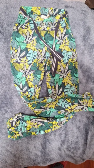 Vendo pantalón largo fino estampado tropical para niña de la marca Boboli. Sin manchas ni roturas. Ideal para entretiempo. A SÓLO 3,5e!!! Preferentemente entrega en mano en Tarragona ciudad. - Talla 10. - Cintura con cinturón a juego. - Estampado de hojas tropicales en verde, amarillo y blanco.