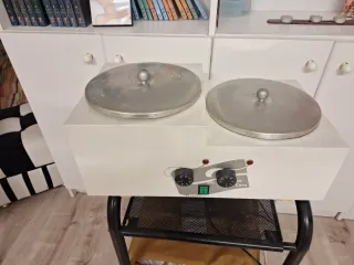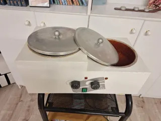 Calentador profesional para cera. - Diseño compacto y funcional. - Tapa metálica con asa. - Dos ruedas de control de temperatura.