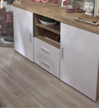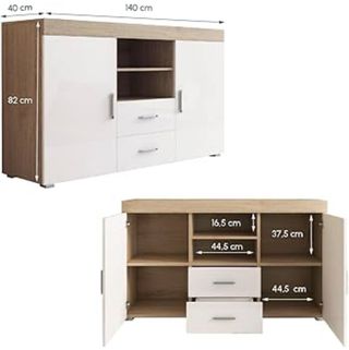 Mueble aparador con un diseño moderno y funcional. - Acabado en blanco y madera. - Puertas y cajones para almacenamiento. - Estante abierto central.