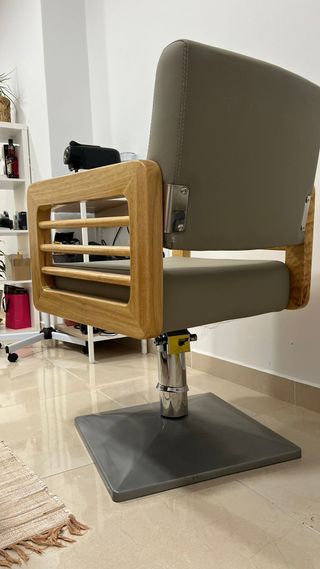 Conjunto de sillón y silla de peluquería con un diseño moderno y funcional. - Estructura de madera y metal. - Tapicería en tono grisáceo.