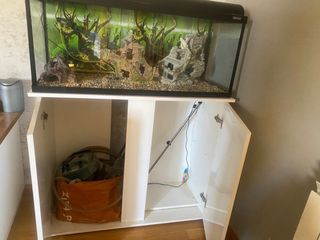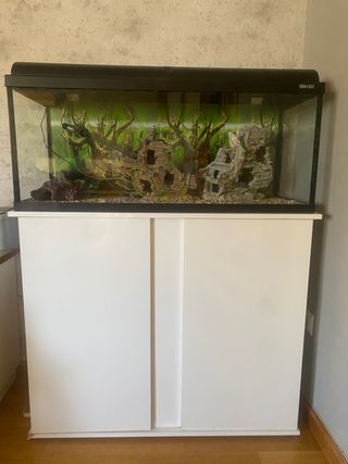 Acuario de 160 litros con un diseño moderno y elegante, perfecto para tu hogar. Incluye un mueble blanco a juego que proporciona un soporte estable y espacio de almacenamiento. - Capacidad: 160 Litros - Color del mueble: Blanco - Incluye decoración interior y calentador.