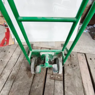 Carro de carga de color verde, con ruedas y mangos para facilitar el transporte. - Estructura metálica. - Ruedas para movilidad. - Mangos ergonómicos.