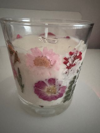Vela decorativa con un diseño único, ideal para ambientar cualquier espacio. - Contiene pequeñas rosas secas. - Cera de color rosa intenso. - Incluye una vela central blanca.