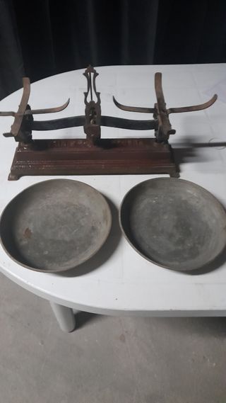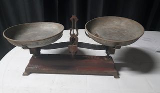 Báscula antigua de dos platos, ideal para coleccionistas o decoración. - Base de metal con acabado en color rojo. - Dos cuencos de metal para pesar. - Mecanismo de equilibrio central.