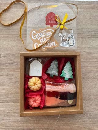 Preciosa caja de regalo artesanal, perfecta para esta Navidad. Contiene varios detalles decorativos,jabones,velas. - Dos jabones con forma de árbol de Navidad. - vela de cera de soja forma de mandarina - Jabón con forma de mandarina. - Jabón con canela/mandarina - . Adorno de cerámica para árbol de Navidad en forma de casa