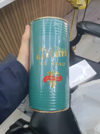 Perfume Jean Paul Gaultier Le Beau Le Parfum. - Envase cilíndrico de color verde esmeralda. - Detalles dorados con el nombre de la marca y el perfume. - Incluye un distintivo rojo con Le Parfum y un diseño de hoja.