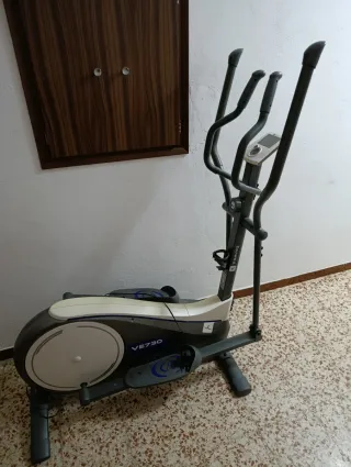 Bicicleta elíptica marca VE730 en muy buen estado. Ideal para entrenamientos cardiovasculares en casa. - Diseño moderno en blanco y gris. - Pantalla digital para seguimiento de datos. - Pedales amplios y cómodos.