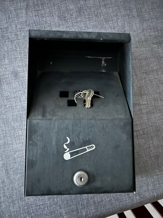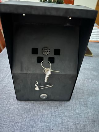 Cenicero de pared de color negro, diseñado para su instalación en exteriores o interiores. - Fabricado en metal resistente. - Incluye un sistema de cierre con llave para su vaciado seguro. - Cuenta con un símbolo de cigarrillo y humo grabado en la parte frontal. - Dispone de una rejilla superior para la introducción de residuos. solo se usó un mes