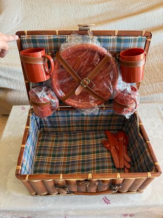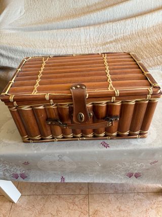 Maletín de picnic con un diseño clásico y materiales naturales. - Fabricado en bambú. - Incluye platos y tazas. - Cierre de cuero.