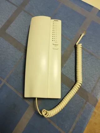 Telefonillo Fermax de color blanco, diseñado para sistemas de videoportero. - Incluye base y auricular. - Botón azul central. - Cable en espiral. Lo vendo porque me he puesto uno con pantalla. Funciona perfectamente y está nuevo