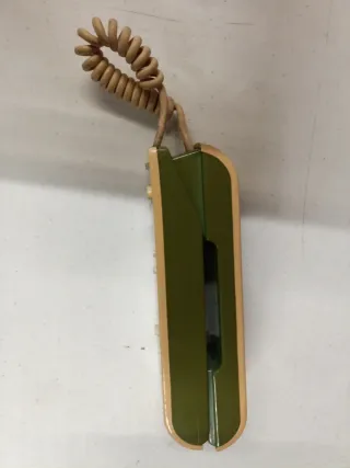 Teléfonillo de puerta antiguo en color verde con detalles en color crema. - Diseño retro. - Rejillas de altavoz. - Cable en espiral.