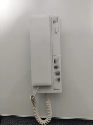 Telefonillo de color blanco, con un diseño moderno y funcional. Ideal para completar tu instalación de intercomunicador. - Cable en espiral. - Montaje en pared.