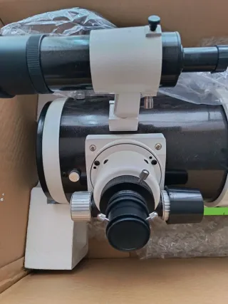 Telescopio reflector Sky-Watcher 150/750 PDS. - Diámetro: 150 mm - Distancia focal: 750 mm - Modelo: PDS Con buscador 9x50, mejor de lo que lleva de serie 6x30. El tubo tiene un pequeño rasguño hecho cerrando los anillos. No afecta en absoluto al telescopio. El tubo se compró a principio de enero 2025, usado un par de veces desde la terraza de mi casa.