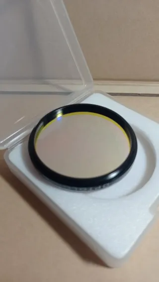 Set de filtros para telescopio, incluyendo un Barlow y un reductor de focal. Ideal para mejorar tus observaciones astronómicas. - Filtro amarillo Omegón (No. 12) - Filtro azul claro Explore Scientific (No. 82A) - Barlow 5x Datyson - Reductor de focal 0.5x Datyson