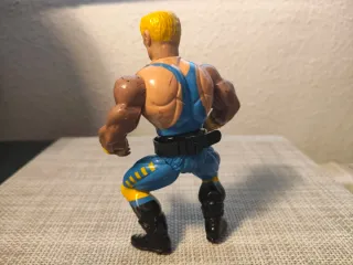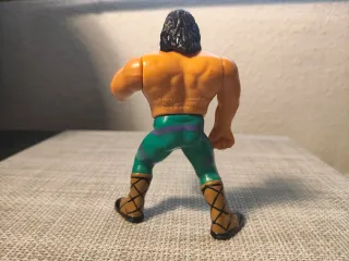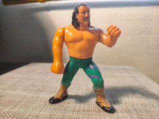 Figura de acción del luchador Jake The Snake Roberts. - Figura de plástico. - Pantalones verdes con detalles morados. - Botas marrones y negras.