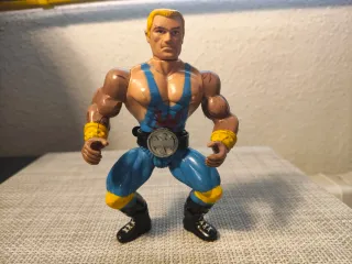 Figura de acción The American Eagle. - Traje azul con detalles rojos y amarillos. - Cinturón negro con hebilla plateada. - Brazaletes amarillos. - Botas negras con detalles blancos.
