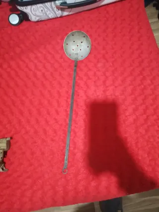 Cuchara colador de metal con mango largo. - Diseño con múltiples agujeros. - Mango con orificio para colgar.