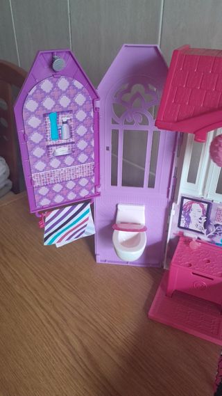 Casa de vacaciones portátil de Barbie. como nueva con poco uso todos los artículos que traía junto con la casa están nuevo y no falta ninguno consta de: Casa barbie, toalla baño, cepillo de pelo, un frasco de perfume, un jarrón con flores, un despertador, un secador del pelo, dos vasos, dos platos, dos cuchara, dos tenedores, un cuchillo, una tetera, una sartén, una almohada, una sábana de cama, dos taburetes y lámparas del techo.