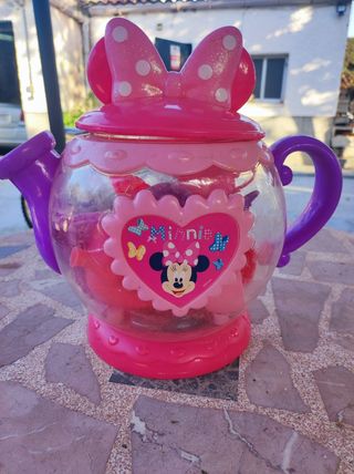 Tetera Minnie juguete con platos, tazas y tetera. Una taza morada es de otra colección pero es casi igual