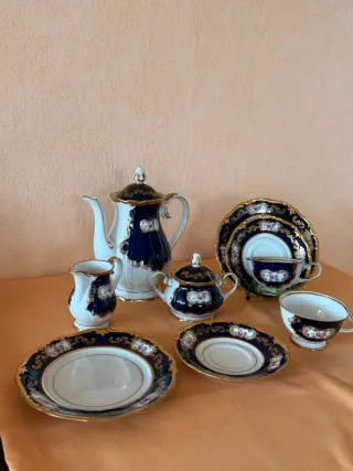 Elegante juego de café y té de porcelana con un diseño clásico. - Incluye cafetera, tetera, azucarero, lechera, tazas y platos. - Decoración floral azul y dorada. - Acabado brillante.