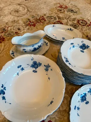 Conjunto de vajilla de porcelana blanca con delicado diseño floral en azul. - Tetera - Azucarero - Lechera - Plato - Faltan algunas piezas.
