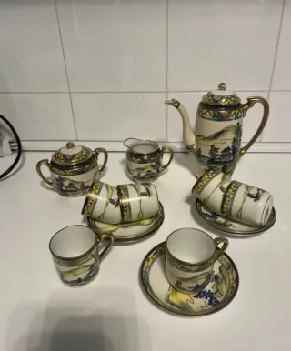 Precioso juego de té de estilo japonés, con un diseño vintage y detalles pintados a mano. - Incluye tetera, azucarero, lechera y tazas con sus platos. - Decoración con paisajes y motivos orientales. - Bordes y asas dorados.