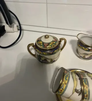 Se puede recoger en Moratalaz, Cuatro Vientos o en la zona centro de Madrid. Elegante juego de té de con detalles en azul y oro. Perfecto para ocasiones especiales. - Incluye tetera, azucarero y dos tazas con platillos. - Diseño clásico con motivos florales y ribetes dorados.