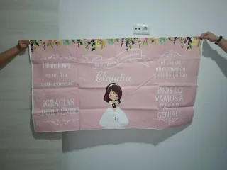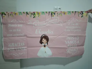Cartel personalizado para la Primera Comunión de Claudia. Un bonito recuerdo para este día especial. Mide 82 x 1,50 cm - Diseño en tela rosa con flores. - Incluye el nombre Claudia. - Mensajes: ¡Sonríe hoy es un día muy especial!, ¡GRACIAS POR VENIR!, el día de mi comunión mola mogollón, ¡NOS LO VAMOS A PASAR GENIAL!. - Ilustración de una niña con vestido de comunión.