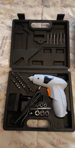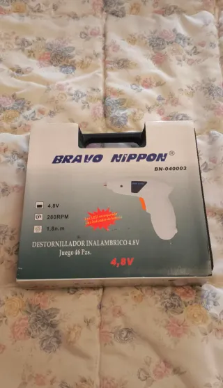 Atornillador eléctrico inalámbrico marca Bravo Nippon. - Voltaje: 4.8V - Velocidad: 280 RPM - Torque: 1.8 Nm - Incluye luz LED incorporada. - Indicador de batería. - Juego de 46 piezas.