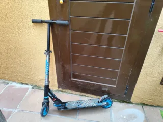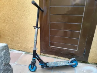 Patinete infantil con un diseño moderno y llamativo. - Manillar ajustable en altura. - Ruedas de color azul. - Plataforma con diseño gráfico. - Estructura de metal resistente.