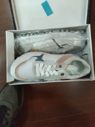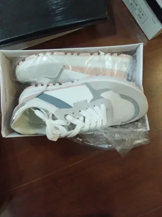 Zapatos de mujer en caja, perfectos para un estilo casual. - Diseño moderno en blanco con detalles en rosa y azul. - Cierre con cordones. - Suela de goma.