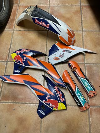 Conjunto de plásticos y protectores para moto de cross KTM con diseño Red Bull. - Guardabarros delantero. - Plásticos laterales. - Protectores de horquilla con logos Michelin, Motorex y Galfer.