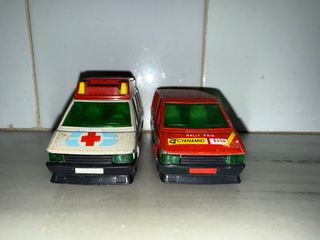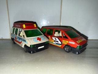 Lote de dos coches de juguete y colección raros de encontrar a escala 1/43 de la marca Guisval, modelo Renault Espace, con alguna marca de juego,alguna falta y suciedad. - Un modelo es una ambulancia con Urgencias y Hospital. - El otro modelo es un coche de rally rojo con el número 9 y patrocinadores como Nikon cibie y Shell, le falta la parte del tablier, consultar fotos detalladas