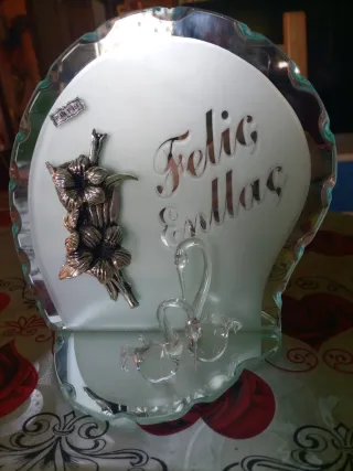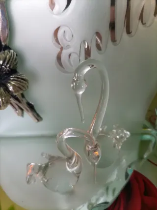 Preciosa placa de casament amb 2 cignes de vidre i unes flors de plata, porta escrit Feliç enllaç, fa 19 cms. d'altura per 19 cms. d'amplada. És completament nou per tancament de botiga. - Grabat Feliç enllaç - Adorno de flors de plata - Figuras de cignes de vidre - Base de vidre amb mirall per tot el voltant