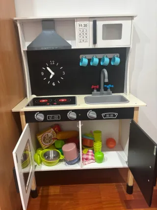 Divertida cocinita de madera para que los más pequeños jueguen a ser chefs. - Incluye accesorios como platos, vasos y comida de juguete. - Diseño con horno, microondas y fogones. - Pizarra para anotar recetas o menús.