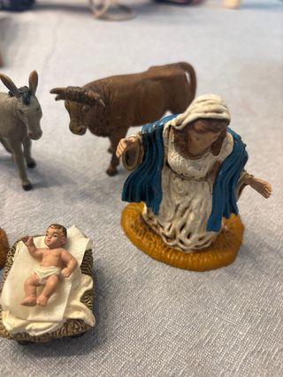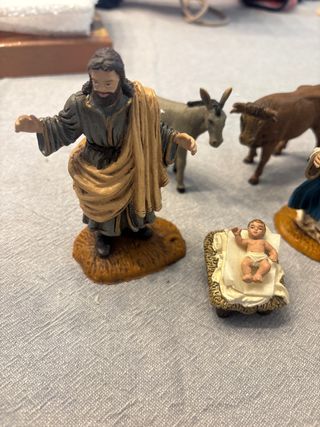 Conjunto de figuras para un belén o nacimiento. - Incluye figuras de San José, el Niño Jesús en su cuna, un burro y un toro. - Figuras detalladas para recrear la escena del nacimiento.