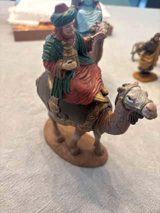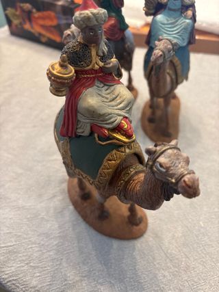 Conjunto de figuras de los Reyes Magos para el Belén. - Representación de los Reyes Magos a caballo. - Detalles en dorado y colores vivos. - Figuras de resina.