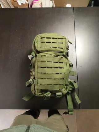 Mochila de estilo militar en color verde oliva. Diseñada para ser práctica y resistente. - Compartimento principal espacioso. - Bolsillos frontales adicionales. - Sistema MOLLE para acoplar equipo. - Correas ajustables para mayor comodidad.