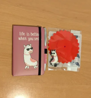 Vendo pack de regalo de la marca Ale-Hop, con temática de Llamas/Alpacas. Todo está totalmente nuevo a estrenar (el accesorio de infusionea conserva su precinto original). - Libreta con diseño de llama y frase Life is better when you smile. - Tapa de silicona para infusión con diseño a conjunto. - Incluye bolígrafo rosa también a conjunto.