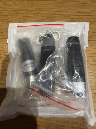 Se venden tres mandos para puerta de garaje. Son negros y plateados, con anilla para llavero. - Tres unidades incluidas. - Diseño compacto y funcional.