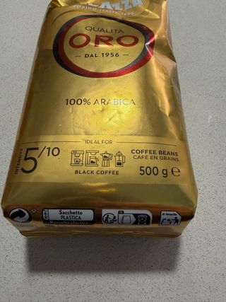 Café en grano Lavazza Qualità Oro, 100% Arábica. Ideal para café negro. - Intensidad 5/10. - Tueste medio. - Aroma intenso y sabor equilibrado. - Bolsa de 500g.