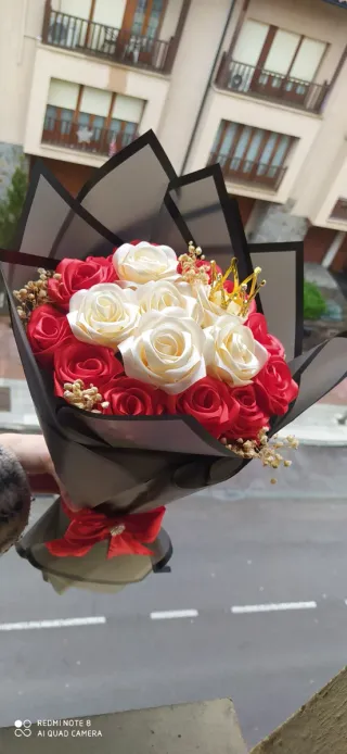 Precioso ramo de rosas artificiales, perfecto para regalar o decorar. - Flores de tela en color rojo y blanco. - Adornado con un lazo rojo y una pequeña corona dorada. - Incluye detalles secos para un acabado natural. Disponible ‼️