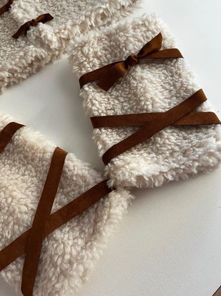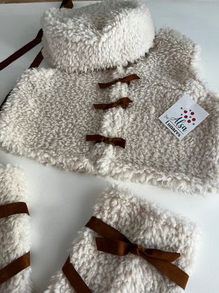 Conjunto de pastor para niño/a, talla 6. Ideal para disfraces o eventos. - Tejido suave y cálido de borreguito. - Cierre con lazos marrones. - Incluye gorro a juego.