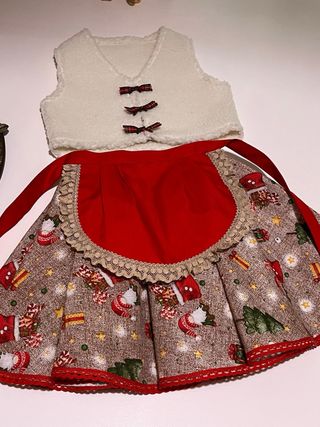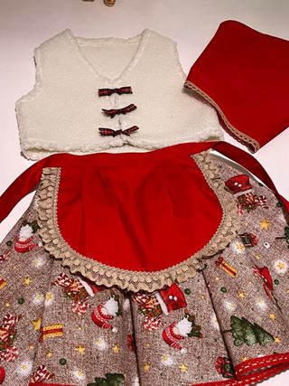 Traje de pastora con estampado navideño, ideal para fiestas. - Talla 6-7 años. - Tejido de algodón con estampado de cuadros rojos y motivos navideños. - Delantal rojo con encaje blanco. - Parte superior blanca con detalles de lazo.